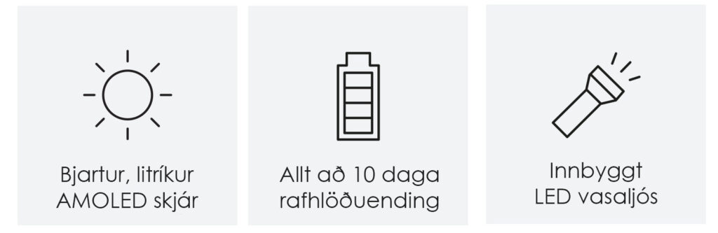 Frábær rafhlöðuending eða allt að 10 dagar. Ending á einni fullri hleðslu fer eftir notkun, hvort að þú ert að nota GPS möguleikann, Bluetooth og fleira.